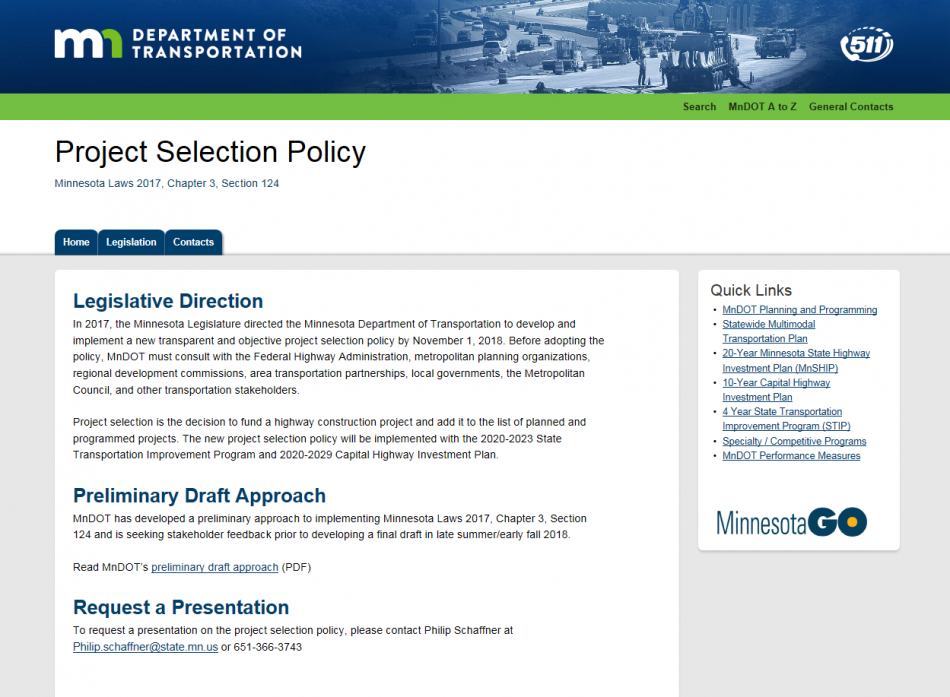 In the Statewide Multimodal Transportation Plan and the Minnesota State Highway Investment Plan, MnDOT committed to increasing the transparency of the agency's project selection process. In 2017, the Minnesota Legislature also directed MnDOT to develop an objetice and transparent project selection policy that uses numeric scoring. Since September 2017, MnDOT's Project Selection Process Manager has been working to develop a project selection policy, including identifying project selection scoring processes.
