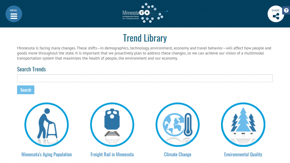 As part of the update to the Statewide Multimodal Transportation Plan, MnDOT produced more than 20 papers that explored the interaction between trends that will shape the future of Minnesota and state’s transportation system. In the SMTP work plan, we committed to keeping these papers up-to-date as a resource for future planning and engagement efforts – anyone can use them! We will also be adding new topics as they emerge.